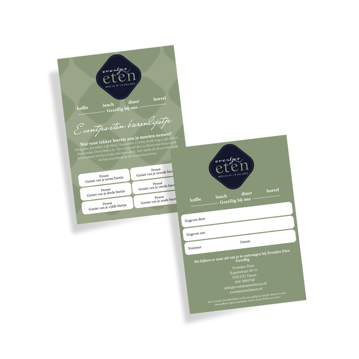 We ontwierpen diverse offline communicatiemiddelen: een drankenkaart, een bier-stempelkaart, cadeaubonnen, visitekaartjes en een feedbackkaart voor gasten.
